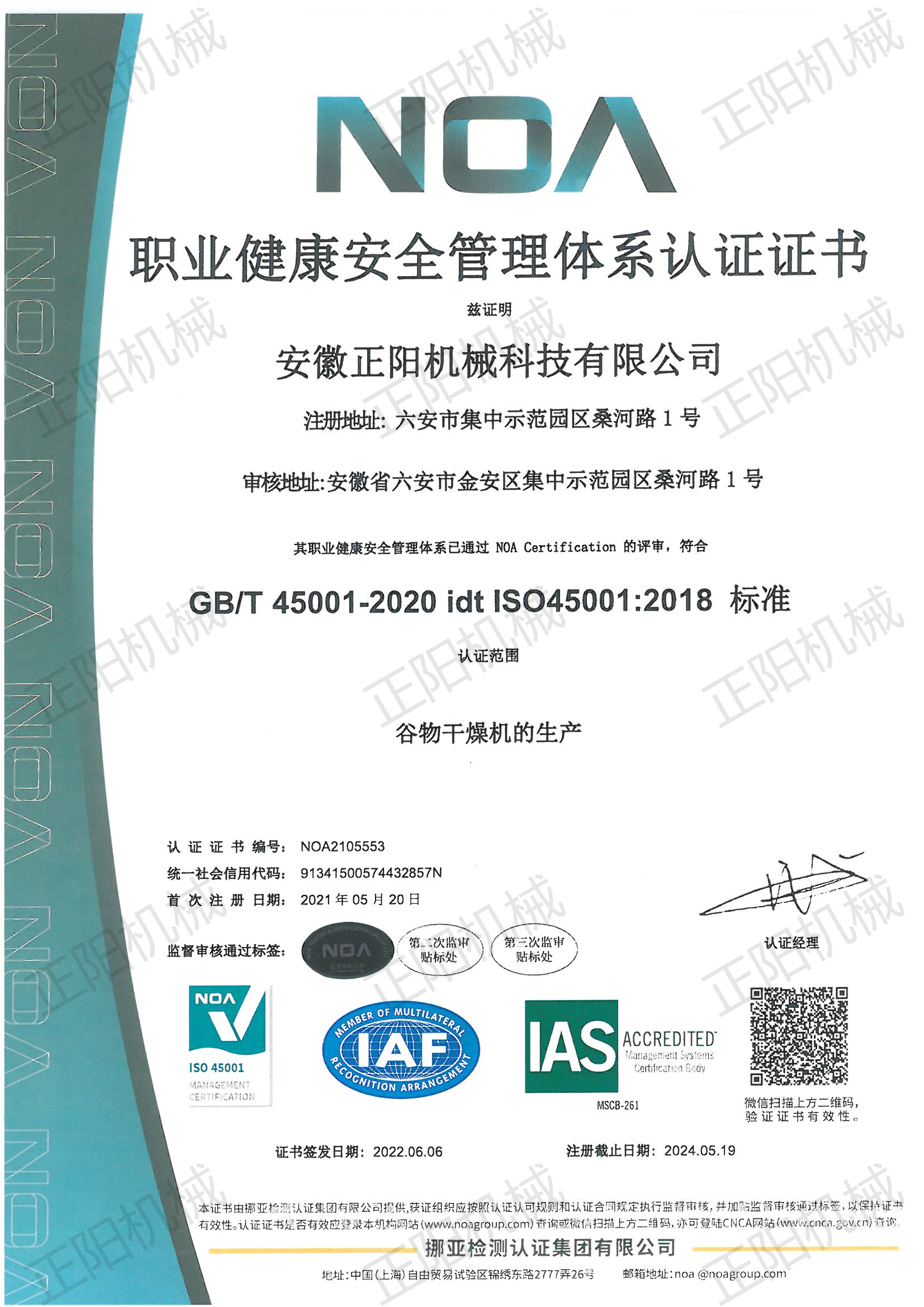 職業健康安全管理體系認證證書