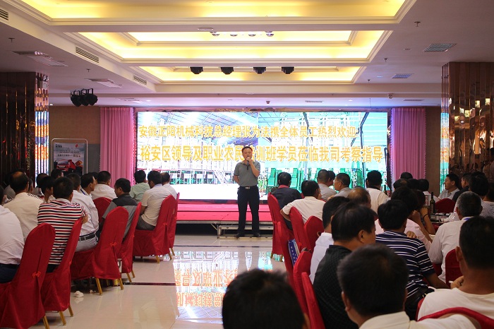 913日下午,裕安區職業農民培訓班一行人蒞臨我公司考察指導,此次培訓班由200多名種植大戶組成,場面十分熱鬧,公司張為法總經理、許為青副總經理、總經理助理胡家冀、銷售部部長張杰等參與了此次接待活動,張為法總經理代表安徽正陽機械科技有限公司表達了對于他們此次來訪的熱烈歡迎。